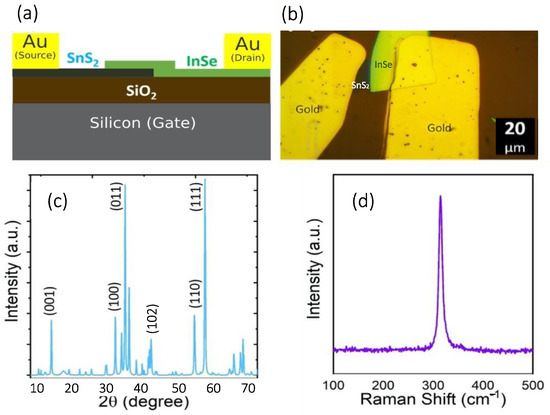 (a) Schematic of SnS2/InSe photodetector. (b) Optical microscope image of the fabricated device. (c) XRD spectrum of the SnS2 Crystal. (d) Raman Spectrum of the SnS2 layer.