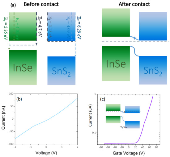 (a) Band diagram of SnS2/InSe heterostructure before and after contact, after contact, electron transfer from InSe to SnS2 and hole transfer from SnS2 to InSe (Ef, Ec, and Ev are Fermi level, conduction band edge, and vallance band edge, respectively, The energy values are shown in figure). (b) Typical current-voltage curve of the device. (c) Drain current versus gate voltage of the device. Inset presents band diagram in positive gate voltage.