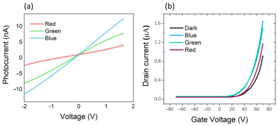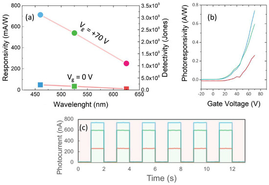 The photocurrent (Iph = Ilight − Idark) of the device under illumination by three light sources with wavelengths of 460, 525, and 625 nm at the optical power of 1 µW is shown in Figure 3a. As is shown, shorter wavelengths, or more energetic photons for a given bias voltage, result in higher photocurrent. The depletion charge density can be calculated by QD = C × ∆Vth/e, where C and ΔVth are capacitance and threshold voltage shift, respectively. By using the carrier density, the photogain can be calculated through the G = Iph/(e × QD × S) [25]. According to Figure 3b, the threshold voltage shift is equal to 10 V for 460 and 525 nm wavelength and 5 V for 625 nm wavelength. By applying +70 V gate voltage, the calculated QD are ≈ 7.31 × 1011 cm−2 for both 460 and 525 nm and 3.65 × 1011 cm−2 for 625 nm and photogain are 1.05 × 1010, 8 × 109, and 7.45 × 109 for 460, 525, and 625 nm, respectively.