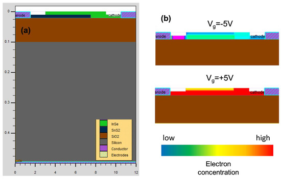 (a) Schematic of the simulated structure (500 nm × 12 μm). (b) Carrier concentration at positive and negative gate voltage in the channel.