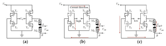 As shown in Table 1 and Figure 1b, Condition 1 depicts the current path in the circuit. The direction of the current flowing through the memristor MB is from node A to node B. The output voltage Vout is greater than 0 and can be expressed as