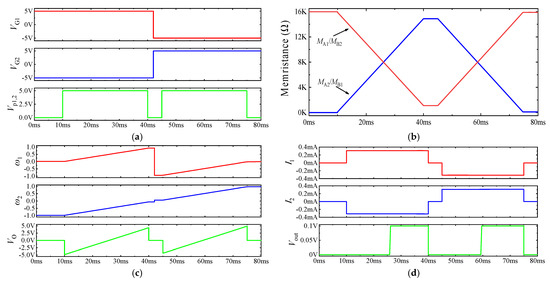 where , for RON << ROFF, and the memristances MA and MB are all within [RON, ROFF]; thus, when MB = RON, ω = ±RON/(ROFF + RON) ≈ 0, and, when MB = ROFF, ω = ± ROFF/(RON + ROFF) ≈ 1. It can be concluded that ω can be changed in the range of [−1, 1]. Therefore, ω can be used to represent the weight of synaptic circuits and can realize “positive”, “negative”, and “zero” weights.
