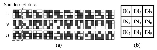 Because the goal of this paper was to identify a character image with a resolution of 3 × 3, it was designed to map the pixels in the image to be identified to a one-dimensional vector In = [IN1 IN2 IN3 IN4 … IN9]T according to the sequence shown in Figure 4b and then input it into the nine-input memristive neuron circuit. In this process, logic “1” = 1 V and logic “0” = 0 V were used to represent the black and white in each pixel to realize the picture recognition.