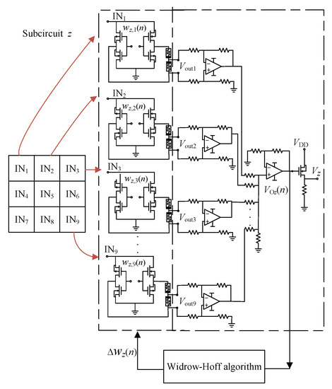 where Δωz(n) represents the synaptic circuit weights that need to be updated in the n iteration, and α is the learning rate. The algorithm will be more accurate if the value of α is smaller, but it leads to a slower convergence speed of the algorithm. Therefore, α is selected as 0.1. The calculation process of the Widrow–Hoff algorithm can be realized either using a full circuit [28,31,32] or using a combination of software and hardware [33,34,35]. In this paper, Matlab software was used to complete the above iterative calculation.