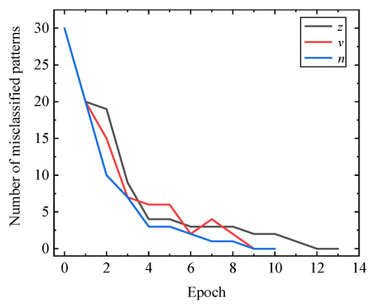 Specifically, the Widrow–Hoff algorithm is used to train the character recognition network circuit. The Widrow–Hoff learning algorithm is an approximate steepest descent method, which uses the mean square error (MSE) as the loss function. Therefore, it is necessary to set the expected outputs of the three subcircuits to tz, tv, and tn, respectively, and then calculate the mean square error with the actual outputs of each subcircuit. Specifically, when the picture z is input to the circuit, [tz, tv, tn] = [1, 0, 0] should be set in the algorithm; that is, the expected output of Subcircuit z is set to 1, and the expected outputs of Subcircuit v and Subcircuit n are both set to 0. When the input pictures are v and n, [tz, tv, tn] = [0, 1, 0] and [tz, tv, tn] = [0, 0, 1] should be selected. Taking Subcircuit z as an example, the error signal in the n iteration is