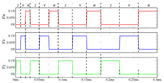 The simulation results of the circuit verification stages are shown in Figure 7. The green, blue, and red curves represent the output voltages of the subcircuits z, v, and n, respectively. The letters between dotted lines represent the input character pictures at this timepoint. For example, when the picture z was input at 0–0.01 ms, the output Vz of the neural network Subcircuit z was high (0.1 V). The output of other subcircuits was at a low level (0 V), indicating that the circuit successfully recognized the character picture z. As can be seen from Figure 7, when the picture datasets were input into the recognition network circuit in the above order, the circuit could output a corresponding correct waveform. Therefore, the proposed three-character recognition network circuit could correctly recognize all character pictures after training.
