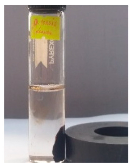 The formation of Fe3O4 NPs was initially assessed by (a) visual observation, (b) magnetic behavior, and (c) UV−Vis spectroscopy. The color of the reaction mixture was changed from dark brown to black at the time of synthesis and it was the key sign of the formation of Fe3O4 NPs [29]. Furthermore, the synthesized NPs in the aqueous solution were attracted to the ferrite ring magnet and deposited at the side of the magnet (Figure 1). When the ring magnet was rotated, the deposited Fe3O4 NPs were also rotated. This phenomenon was not observed without the external magnetic field, which specified the formation of Fe3O4 NPs. The chemical reaction of Fe3O4 NPs formation can be hypothesized by Equations (1) and (2) [12]. In the first step, it was presumed that the phytochemicals (polyphenols, flavonoids, polycarboxylic acid, etc.), present in the B. ramiflora leaf extract, acted as chelators to form the iron-phytochemicals complex. The next step was the conversion of phytochemicals-Fe(OH)2/Fe(OH)3 into spherical-shaped Fe3O4 NPs due to the addition of NaOH. In a similar study, Yew et al. [15] described that the positively charged Fe3O4 NPs are surrounded by the negatively charged groups of phytochemicals via the weak van der Waals forces that stabilize the molecular structure of magnetic particles.