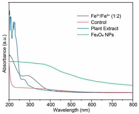 UV−Vis spectrum of Fe2+/Fe3+ (1:2), control, B. ramiflora leaves extract and synthesized Fe3O4 NPs.