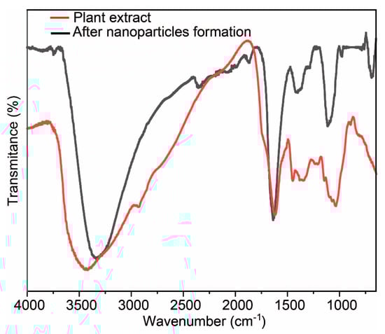 FTIR spectroscopy is an effective tool for the characterization of various functional groups that are capped on the surface of metallic NPs [15]. The FTIR spectrum of B. ramiflora leaves and the synthesized magnetite nanoparticles (Figure 3) exhibited characteristic bands at 3333 cm−1, 2335 cm−1, 1647 cm−1, 1414 cm−1, 1121 cm−1, 973 cm−1, and 703 cm−1. The peak at 3333 cm−1 represents the existence of the O−H group of phenolic compounds, which mainly act as reducing agents for the NPs synthesis [28]. The band at 1647 cm−1 is attributed to the presence of the C=O group of carboxylic acid, which acts as a capping agent. The bands at 1414 cm−1 and 1121 cm−1 are attributed to the occurrence of aromatic amine (N−H bond) [29] and the C−O stretching frequency of phenolic compound, respectively [15,26]. The peak 703 cm−1 reveals the presence of an aromatic C−H bending band. The shifting of all FTIR bands denotes the formation of nanoparticles with the B. ramiflora extract.