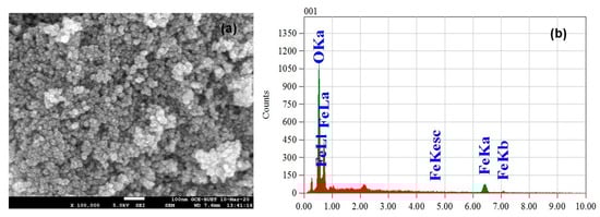 (a) SEM images of synthesized Fe3O4 NPs, (b) EDS of Fe3O4 NPs.