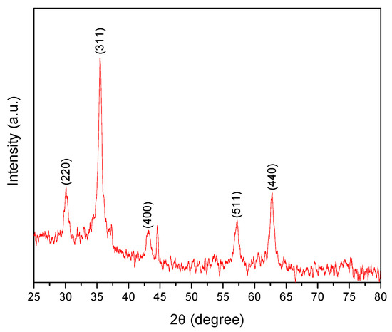 The confirmation of the crystalline nature of Fe3O4 NPs was established using powder XRD. The XRD pattern of Fe3O4 NPs, synthesized using aqueous leaves of B. ramiflora leaves, is given below in Figure 5. The brag reflection peaks were detected at 2θ values at 30.1°, 35.5°, 43.21°, 57.01°, and 62.61°, respectively indexed to (220), (311), (400), (511) and (440) planes which exactly matched with JCPDS No. 19−0629. The size of MNPs was calculated using the Debye–Scherrer formula: