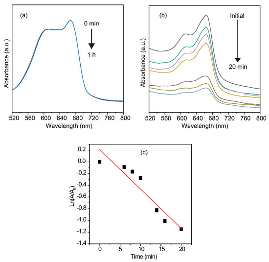 Catalytic reduction of MB using NaBH4 (a) MB in absence of NPs, (b) MB in presence of NPs, (c) Ln (A/A0) vs. time plot of MB reduction.