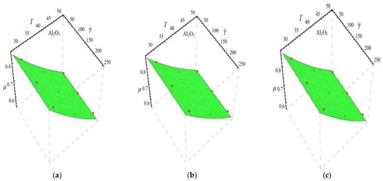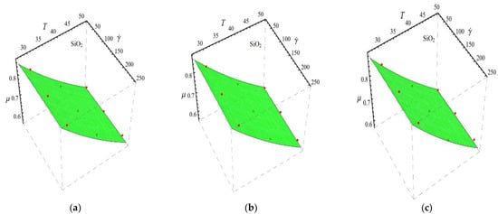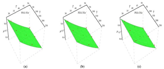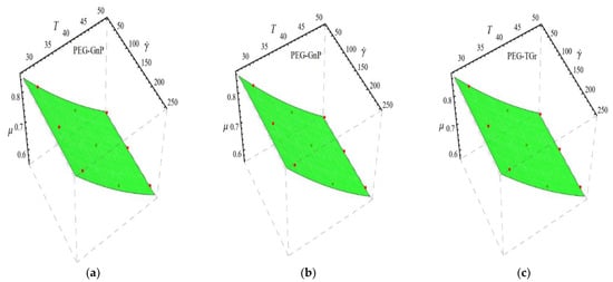 Figure 4. Fitting the Equation (2) for experimental data of PEG-GnP/DIW nanofluid at different nanoparticle volume fractions (a) ϕ = 0.025 % , (b) ϕ = 0.05 % and (c) ϕ = 0.075 % .