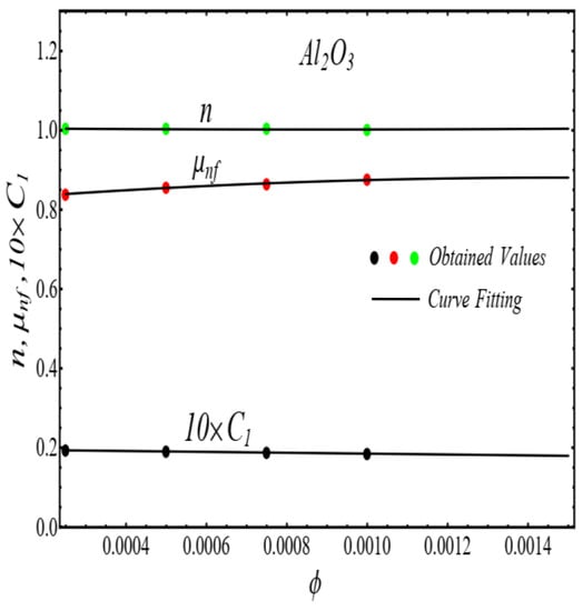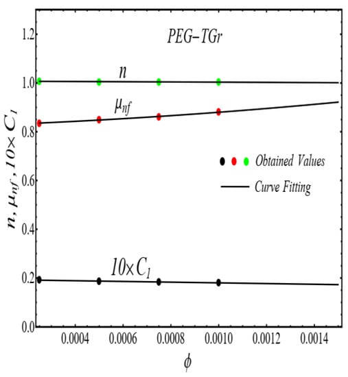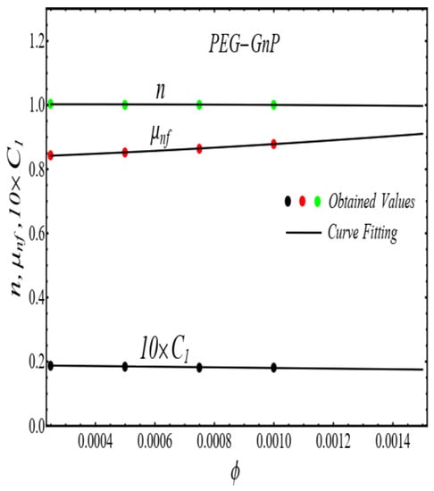 Here n ,   μ n f and C 1 are curve fitting parameters. The numerical values of these parameters are obtained by fitting the Equation (2) to experimental data [1]. The best-fitting results are presented in Figure 1, Figure 2, Figure 3 and Figure 4. In these figures, dots represent the experimental data [1] and graph illustrates the Equation (2).