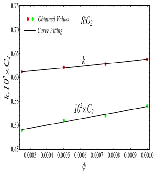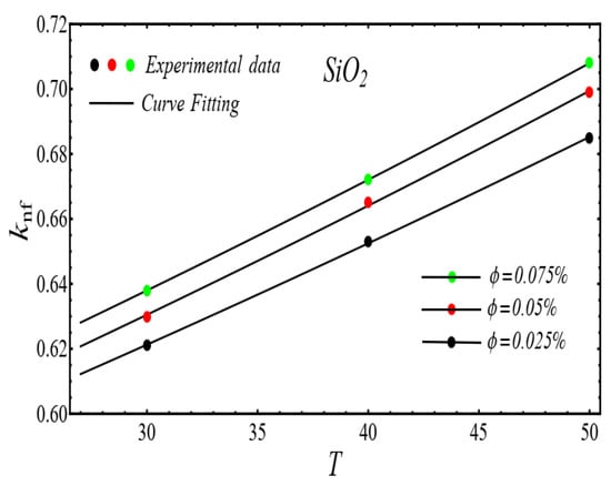 Figure 9. Fitting the Equation (4) for experimental data of SiO2/DIW nanofluid at different nanoparticle volume fractions.