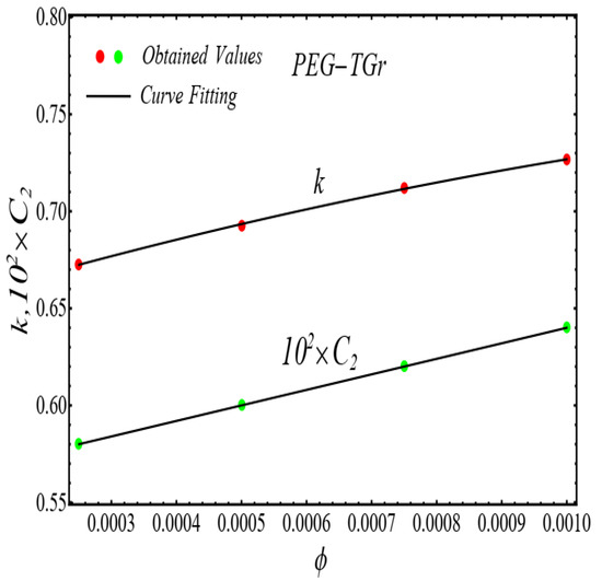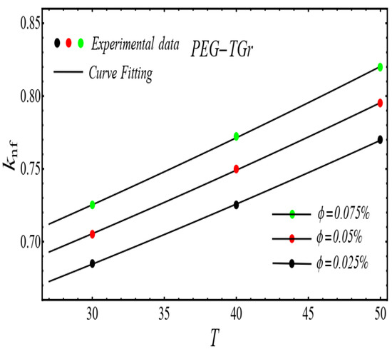 Figure 11. Fitting the Equation (4) for experimental data of PEG-TGr/DIW nanofluid at different nanoparticle volume fractions.