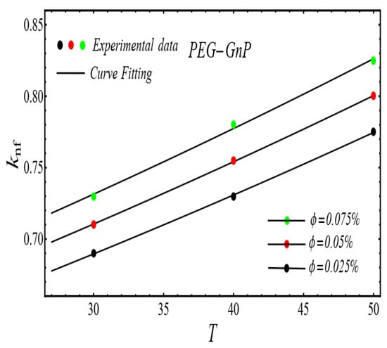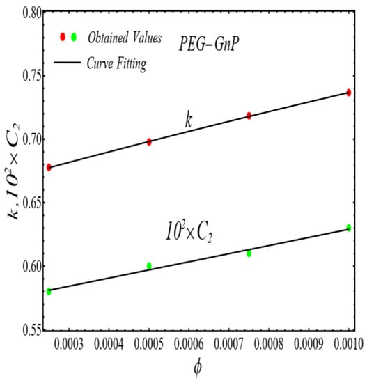 Figure 12. Fitting the Equation (4) for experimental data of PEG-GnP/DIW nanofluid at different nanoparticle volume fractions.