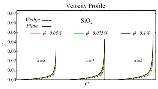 Figure 20. Velocity profile of SiO2/DIW nanofluids over the wedge and plate under the impact of nanoparticle volume fraction.