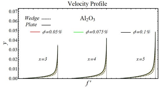 Figure 21. Velocity profile of Al2O3/DIW nanofluids over the wedge and plate under the impact of nanoparticle volume fraction.