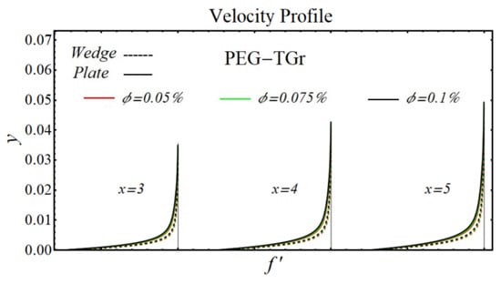 Figure 20, Figure 21, Figure 22 and Figure 23 illustrate the graphs of velocity profiles for SiO2/DIW, Al2O3/DIW, PEG-GnP/DIW, and PEG-TGr/DIW nanofluids under the influence of different nanoparticle volume fractions for both moving wedge and plate. It is seen that the values of viscosity of schematic nanofluids are amplified due to increasing the nanoparticle concentration. Given this evidence, the velocity profile of all schematic nanofluids over both geometries is decreased by raising the nanoparticle volume fraction. It is also observed that the profile of velocity is slowed down over a moving plate as compared to a moving wedge.