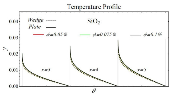 Figure 24. The temperature profile of SiO2/DIW nanofluids over the wedge and plate under the impact of nanoparticle volume fraction.