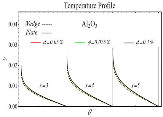 Figure 25. The temperature profile of Al2O3/DIW nanofluids over the wedge and plate under the impact of nanoparticle volume fraction.