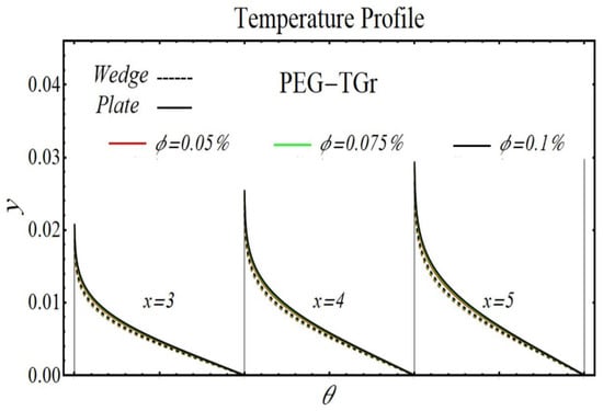 Figure 26. The temperature profile of PEG-TGr/DIW nanofluids over the wedge and plate under the impact of nanoparticle volume fraction.