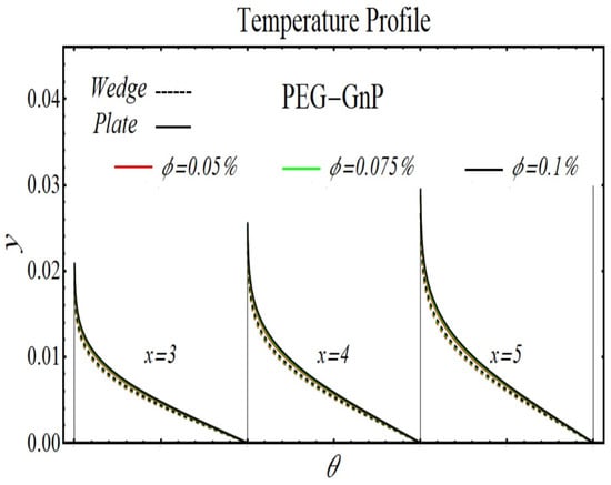 Figure 27. The temperature profile of PEG-GnP/DIW nanofluids over the wedge and plate under the impact of nanoparticle volume fraction.