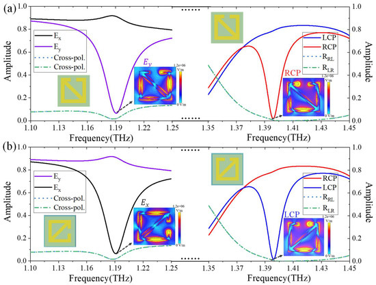 First, we studied the reflection spectrum of two pairs of structural units under different polarized waves. As shown in Figure 2a,b, when the APCM is excited by a linearly polarized wave, the reflection difference between the x-polarized wave and the y-polarized wave is around 1.19 THz and can reach approximately 0.85. It can be seen that the reflectivity of linear cross-polarized waves is very low and can be ignored. Similarly, we calculated the reflection spectrum of the complementary structure in the first pair of structural units. It can be noticed that the reflection spectrum of the x-polarized wave and the y-polarized wave are completely opposite, and the reflection difference is about −0.85. In addition, when the APCM is excited by a circularly polarized wave, the reflection difference between the LCP waves and the RCP waves is around 1.395 THz and can reach about 0.8. Similarly, we also calculated the reflection spectrum of the complementary structure in the second pair of structural units. It can be found that the reflection spectra of LCP waves and RCP waves are completely opposite, and the reflection difference is about −0.8. In order to deduce the reason for the strong reflection difference, we calculated the surface electric field distributions of the two pairs of structural units at 1.19 THz and 1.395 THz (the lowest reflectivity), as shown in the inset in Figure 2. It can be found that both linearly polarized waves and circularly polarized waves produce strong resonance absorption on the surface of the structure, which is the most important reason for the low energy.