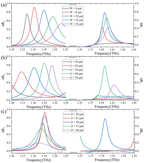 An illustration of the influence of the line width of the aluminum pattern, the opening gap of the aluminum pattern and the height of the polymide on ΔR1 and ΔR2. (a) Simulation results of ΔR1 and ΔR2 under different line width of the aluminum pattern. (b) Simulation results of ΔR1 and ΔR2 under different the opening gap of the aluminum pattern. (c) Simulation results of ΔR1 and ΔR2 under different the height of the polymide.