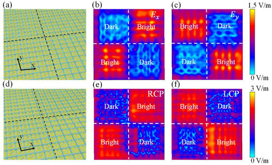 Next, two metasurfaces for the near-field imaging of linearly polarized waves and circularly polarized waves were designed, as shown in Figure 4a,d. Taking into account the convenience of calculation, the two metasurfaces designed both contained 20 × 20 structural unit arrays. In order to better contrast the imaging effect, these two metasurfaces were divided into four parts, and each part contained 10 × 10 structural units. When linearly polarized waves were incident, the near-field images of the metasurfaces at z = 220 μm were calculated, as shown in Figure 4b,c. The bright and dark areas of the near-field image under the incidence of the Ex polarized waves are diagonally distributed. It is worth noting that the bright and dark areas of the near-field image under the incidence of the Ex polarized waves and the Ey polarized waves are just opposite. Similarly, when circularly polarized waves were incident, the near-field images of the metasurfaces at z = 220 μm were calculated, as shown in Figure 4e,f. The bright and dark areas of the near-field image are also diagonally distributed under the incidence of RCP waves. Under the incidence of LCP waves, the bright and dark areas of the near-field image are also just the opposite of the conditions under the incidence of RCP waves. All imaging effects are very good, in line with our design expectations.