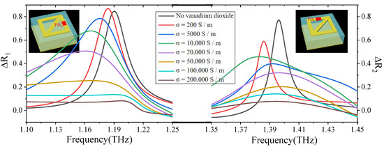 Finally, in order to dynamically control the contrast of the near-field imaging, we filled the opening gap of the designed structure with VO2 material, as shown in the inset in Figure 5 (because the APCM is used as an example above, the complementary structure of the APCM is used here as an example). Since different conductivity of VO2 means different degree of phase transition, the ΔR1 and ΔR2 at the conductivity of 200 S/m, 5000 S/m, 10,000 S/m, 20,000 S/m, 50,000 S/m, 100,000 S/m and 200,000 were calculated, as shown in Figure 5. It can be found that as the conductivity increases, ΔR1 gradually decreases from the maximum value of 0.85. Additionally, the peak of ΔR1 has blue shift and broadening. Similarly, ΔR2 also gradually decreases as the conductivity increases. Additionally, the peak of ΔR2 also has blue shift and broadening. When the conductivity is 200 S/m, both ΔR1 and ΔR2 are at the maximum. The modulation range of ΔR1 is from 0.05 to 0.85 and has a modulation depth of 0.8. In addition, the modulation range of ΔR2 is from 0.05 to 0.6 and has a modulation depth of 0.55. The results are shown in Table 2.