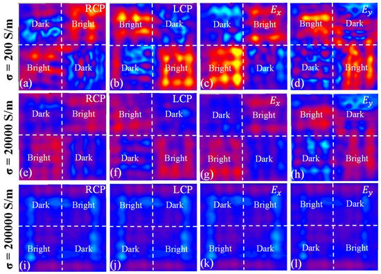(a–d) are the actual effect diagrams of near-field imaging for linearly polarized waves and circularly polarized waves when the conductivity of vanadium dioxide is 200 S/m. (e–h) are the actual effect diagrams of near-field imaging for linearly polarized waves and circularly polarized waves when the conductivity of vanadium dioxide is 20,000 S/m. (i–l) are the actual effect diagrams of near-field imaging for linearly polarized waves and circularly polarized waves when the conductivity of vanadium dioxide is 200,000 S/m.