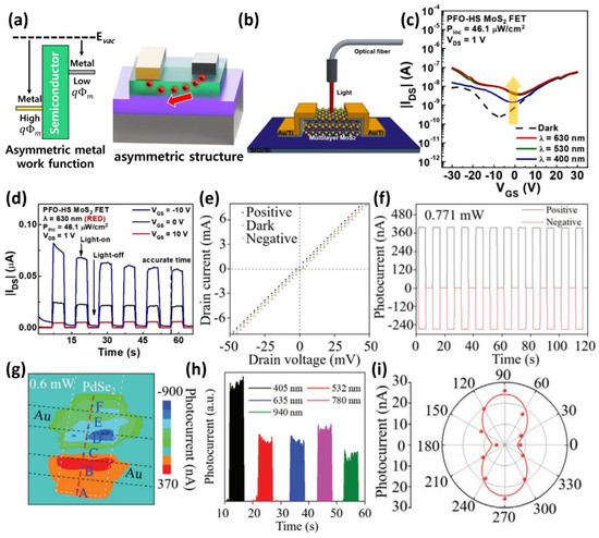 (a) Schematic image of zero bias operation using asymmetric work function electrode or asymmetric electrode structure. (b) Schematic diagram of PFO-doped MoS2 phototransistor and light irradiation measurement. (c) Transfer curve change for each red, green, and blue light source of a PFO-doped MoS2 phototransistor according to the gate voltage. (d) Photoswitching behavior characteristics of PFO-doped MoS2 device according to gate voltage variation (VGS = −10, 0, 10 V) in red (630 nm) light irradiation (adapted from [63] with permission from the Elsevier). (e) Output characteristics of a device under light irradiation conditions (black and cyan solid lines) and in the dark (solid red line). (f) Photocurrent response of laser spot pulses irradiated to the upper and lower interfaces of the PdSe2/Au. (g) Scanning photocurrent microscopy (SPCM) image mapping of the PdSe2 in light of 532 nm, 0.6 mW, and zero bias. (h) Pulse response at broadband light wavelengths of PdSe2 photodetectors. (i) Anisotropic photocurrent response to linearly polarized 532 nm light and the anisotropy ratio is 1.3 (adapted from [64] with permission from the John Wiley and Sons).