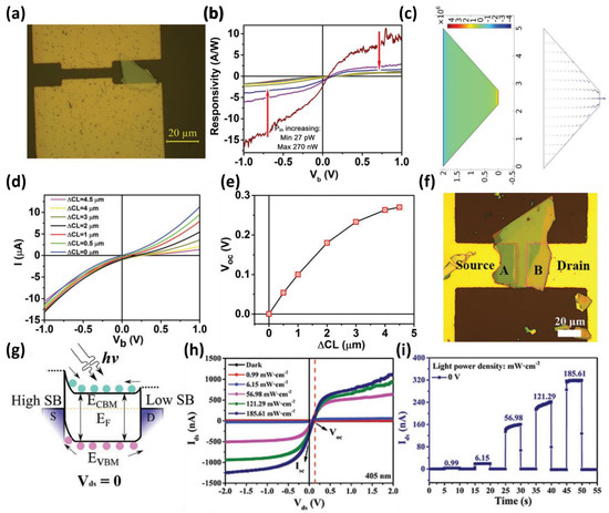 Furthermore, previous studies reported that the intrinsic characteristics of a semiconductor were maintained, and a self-powered operation was implemented through variations in the contact area or material of the electrode. Zhou et al., used the asymmetry of WSe2 flakes to implement a photodetector in a metal-semiconductor-metal (MSM) structure with a low dark current and showed that the self-powered operation could be controlled through simulation [65]. The photovoltaic effect used as the primary mechanism for WSe2-based photodetectors is caused by asymmetric contact lengths similar to reports on silicon using electrodes with different areas [66]. The morphology of the asymmetric WSe2 flakes resulted in asymmetric charge injection from both electrodes (Figure 2a). As shown in Figure 2b, the fabricated device exhibited a photoresponse (A/W) of 2.31 A/W and high detectivity of 9.16 × 1011 Jones at zero bias. As the contact length difference (ΔCL) increases, the open-circuit voltage (VOC) increases, with a concomitant increase in photocurrent at zero bias. The authors simulated I–V curves at various ΔCL to analyze the change in device properties quantitatively according to the change in ΔCL, as shown in Figure 2c,d. As a result, the VOC tended to increase as the change in ΔCL increased (Figure 2e). These structural and electrical tendencies are expected to be applied widely to various semiconductor materials, including TMDs, such as WSe2, with systematic geometry engineering.