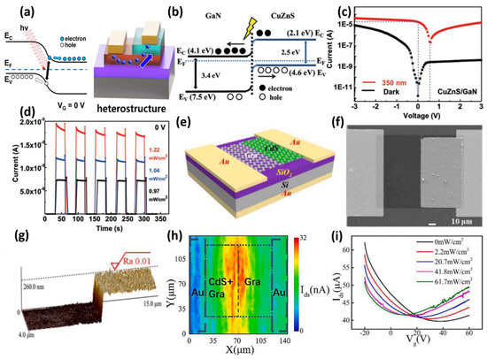 Combinations of various materials, including heterojunctions, can form energy band bending in the junction region and allow photoinduced electron–hole pairs to flow easily [76,77,78] (Figure 5a). Therefore, photodetectors based on various heterogeneous structures, including p–n junctions and n–n junctions, have been reported [79,80,81]. Zhang et al., achieved a photodetector with a high photocurrent and rapid response speed through an asymmetric heterojunction using CuZnS and GaN [82]. The CuZnS used in the device has a photoreaction of UV light (350 nm), but GaN does not show photoreaction. On the other hand, a p–n junction device integrating p-type CuZnS and n-type GaN shows zero-voltage behavior with the band diagram, as shown in Figure 5b. The electrons and holes of the electron–hole pair generated by light flow separately from the valence band of CuZnS and conduction band of GaN through the built-in potential of the p–n junction, respectively. As a result, the CuZnS/GaN device showed an I–V curve, as shown in Figure 5c. Compared to the dark state, the I–V curve is shifted to the right by 350 nm light, showing a high current at 0 V bias. The presented device has a high photocurrent of 19 µA, a large on/off ratio of 3 × 108 and improved detectivity of 8 × 1013 Jones, as shown in Figure 5d, and provides a textbook-like guideline for zero bias using p–n junctions. Gao et al., realized a graphene photodetector that operated with reasonable responsiveness at zero bias through CdS nanocrystal doping and optimized the properties of the photodetector with respect to the doping area ratio (Figure 5e) [83]. These doping solutions improve the photoresponse of two-dimensional materials and make them high candidates for photodetector materials. As shown in Figure 5f,g, a partially doped CdS nanocrystal layer injects electrons from the electron–hole pairs generated by light into the graphene and raises the Fermi level of graphene. This local adjustment of the Fermi level causes a potential difference inside the same single graphene layer and allows a current at a drain voltage (VDS) of 0 V to flow. The current change at the moment of light irradiation was observed through photocurrent mapping to confirm the electron injection from CdS nanocrystal into graphene. Consequently, a high photocurrent was detected in the red region of the graphene/CdS and graphene layer junctions in Figure 5h. These can be attributed to the exchange of electron–hole pairs produced by CdS nanocrystals. In addition, these results are shown through the transfer curve of the photodetector according to the gate voltage in Figure 5i. In the transfer curve, the current difference of the photodetector occurred according to the intensity of light irradiated at the gate voltage of 0 V. The current difference at 0 VGS is sufficient to open the possibility of zero-bias operation. The response results according to the intensity of light indicate that as the intensity of light increases, more photocurrent is generated with a large potential difference inside graphene due to more electron injection. As a result, the device exhibited a response of 0.26 A/W and a quantum efficiency of 51.5% at the maximum optical power density for a modulated specific gate voltage at zero bias.