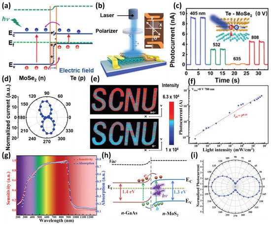 In the same context, Jia et al., fabricated a MoS2/GaAs heterojunction-based photodetector by MoS2 film transfer. They demonstrated a broadband photoresponse from near-infrared to deep-ultraviolet with zero-bias operation [89]. The fabricated MoS2/GaAs heterojunction structure showed a stable response depending on the wavelength and intensity of light at 0 V without an external bias and had a linear response even at a low light intensity of 73 nWcm2 (Figure 6f). In addition, the photodetector showed high reactivity of 35.2 mA/W, stable detectivity of 1.96 × 1013 Jones, and rapid response with a rising and falling time of 3.4 ms and 15.6 ms at zero-bias conditions. As shown in Figure 6g, the photoreaction started at approximately 870 nm, which corresponds to the bandgap of GaAs, indicating that GaAs occupies a large portion of light absorption and photocurrent generation. These microscopic behaviors were analyzed in detail through the band diagram, and the n–n junction of n-type MoS2 and n-type GaAs shows a typical band diagram, as shown in Figure 6h. Electrons and holes generated by the irradiated photons diffuse through the conduction and balance bands of GaAs and MoS2, respectively, enabling zero-bias operation. Furthermore, the author investigated the polarization response of a photodetector fabricated by considering the anisotropy of the crystal structure of the 2D MoS2 film. As a result, the photocurrent generation was largely due to the polarization angle with a peak-to-valley ratio of 4.8 (Figure 6i). This polarization sensitivity will be considered a suitable candidate for next-generation optical applications.