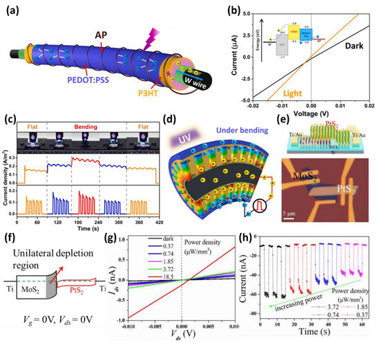 (a) Illustration of optically induced carrier transport inside a vertical heterostructure-based fiber-like photodetector. (b) I-V curves under 365 nm illumination and dark conditions with energy band diagram of the W/ZnO/P3HT/PEDOT:PSS/AP vertical heterojunction. (c) Changes in the photoresponse of the photodetector according to the bending of the wire structure device under the illumination pulse. (d) Schematic diagram of the mechanism of a photodetector using the piezoelectric effect under UV illumination to exhibit an enhanced photo-sensing effect (adapted from [90] with permission from the Elsevier). (e) Schematic diagram and optical microscopy image of PtS2/MoS2 heterostructure photodetector. (f) Energy band diagram showing the unilateral depletion region of MoS2 in the n–n junction structure of MoS2 and PtS2. (g) Shift of ISC and VOC according to the light intensity at a small bias voltage or a bias voltage of 0 V. (h) Photocurrent of the PtS2/MoS2 devices at various power densities at a relatively low operating voltage of Vds = 0.5 V (adapted from [91] with permission from the Royal Society of Chemistry).