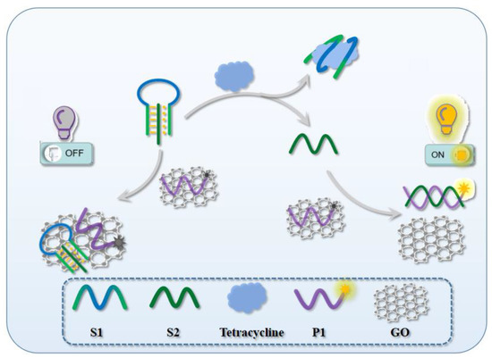 Traditional detection methods of TC include liquid chromatography (HPLC) [8], capillary electrophoresis (CE) [9], liquid chromatography tandem mass spectrometry (LC-MS/MS) [10], immunoassay [11], and enzyme-linked immunosorbent assay (ELISA) [12]. These methods offer high accuracy, sensitivity, and reliability in standard analysis in well-equipped laboratories with the analysis being limited by expensive instruments, cumbersome sample extraction procedures, and a lack of experienced operators. Therefore, in recent years, biosensors for the detection of different substances have developed rapidly due to their advantages of convenience, cheapness, and rapidity. Nanomaterials often have special properties, and the combination with traditional biosensors can realize different degrees of transformation and improve the diversity of biosensors. Specifically, GO and its derivatives can effectively adsorb single strand DNA (ssDNA) and quench the fluorescence it labels or carries by fluorescence resonance energy transfer (FRET), which allows GO to effectively reduce background noise when used in novel fluorescence sensors [13,14]; gold nanoparticles can aggregate and develop color, and different color changes can occur in different degrees of aggregation, thus they have a place in the new colorimetric sensors [15,16]; a gold electrode plate can firmly combine with a sulfhydryl-modified DNA strand to generate electrical changes through different structural DNA and are an indispensable part of the electrochemical biosensors [17,18]. Based on these studies, it is necessary to design a new nanoswitch with a simple operation that combines nanomaterials and biological properties for rapid and sensitive detection of TC.