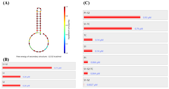 NUPACK simulates S1–S2 stability: (A), S1–S2 binding rate, (B) and component concentration in the presence of TC (C).
