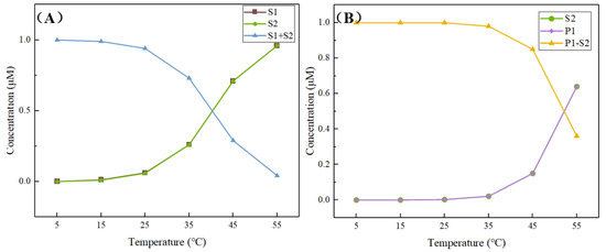 The binding of S1–S2 and P1-S2 at temperatures of 5–55 °C was further simulated to determine the optimal reaction temperature. As can be seen from Figure 3A, the S1–S2 structure has high yield and stable binding at 25 °C, but the binding capacity begins to decrease when the temperature reaches 35 °C, the binding rate is less than 50% at 45 °C, and when the temperature reaches 55 °C, the S1 and S2 strands are completely released into two independent single strands. On the other hand, the trend of P1-S2 yield with temperature is roughly similar to that of S1–S2 (Figure 3B), with the main turning point being 45 °C. In order to prevent spontaneously unwinding of S1–S2 and affecting the detection effect when the temperature is too high, 25 °C was selected as the optimal temperature for the subsequent reaction. In addition, because the above two complexes are synthesized from two substrates, the trend of substrate concentration is similar and overlapping. The results of the simulation experiment with the wet experimental concentration are displayed in the supporting information (Figure S2).
