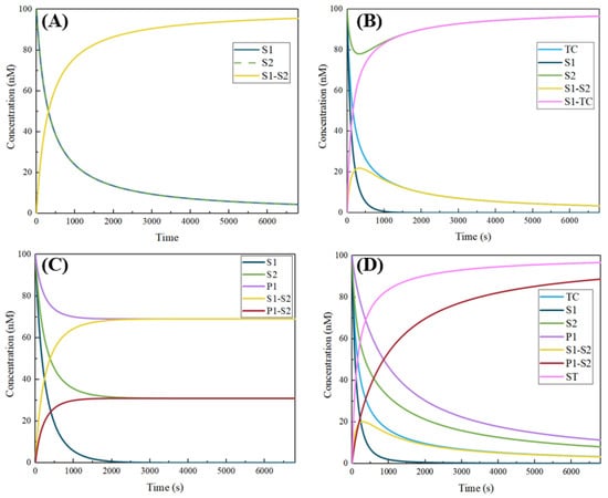 Visual DSD simulates the changes of each component concentration in the system when only S1 and S2 exist (A); S1, S2 and TC exist (B); S1, S2 and P1 exist (C); and all components exist (D).