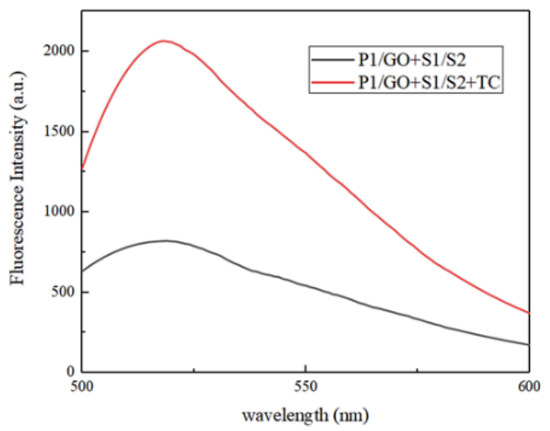 The first step of experimental verification was a feasibility analysis. The fluorescence spectral result shown in Figure 5 is obtained under different conditions. In the absence of target TC, the fluorescence value was low (black curve), which is due to the stable presence of the triple helix structure while P1 is the ssDNA state, so the labeled FAM fluorescence is quenched by GO. The fluorescence increased significantly after the addition of target TC, which represents the fact that after TC binds to the aptamer S1, result in S2 strand is released and can be more fully hybridized with P1, so this affects FAM fluorescence recovery because it is far away from GO (red curve). The two curves with obvious differences can reasonably distinguish whether there is a target, which is a valid description of the scheme.