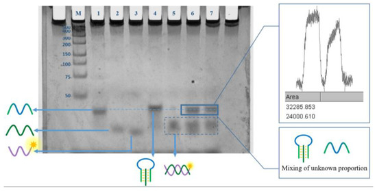 In addition, the polyacrylamide gel electrophoresis (PAGE) experiment also proved the feasibility from another angle. As shown in the Figure 6, lanes 1, 2, and 3 are the cases where S1, S2, and P1 exist alone, respectively, as a reference for subsequent reactions. As can be seen from lane 4, when S1 and S2 are present, a slightly delayed band (S1–S2) will be formed, and the corresponding bands of S1 and S2 disappear, indicating the formation of the S1–S2 structure. Lane 5, when S2 and P1 exist at the same time, it can be seen that new P1-S2 bands are generated. In the presence of TC in lane 6, more S1 strands appear to be released from the triple helix structure than in the absence of a target for lane 7. Image J was used to grayscale analyze the S1 bands in lane 6 and lane 7, and it obtained the same results. The S1 and S1 + S2 composite strips are located very closely together, so we made auxiliary lines to help observe them. It can be seen that S1 is located below the auxiliary line (Lane 1), and the S1 + S2 complex is located above the auxiliary line (Lane 4), but the lagging band in Lane 6 and 7 seems to be just on the auxiliary line and does not perfectly coincide with S1 or S2, so we surmise that this part of the band may be mixed with S1 and S1 + S2 in different proportions. In the presence of TC, the band is roughly located in the middle of the auxiliary line, and the concentration of S1 and S1 + S2 complexes may be similar; in the absence of TC, the band is positioned slightly above the auxiliary line, and the concentration of the S1 + S2 complex may be greater than that of S1. In addition, due to the inevitable temperature increase during the glue running process, which will lead to the spontaneous opening of a small number of S1 + S2 complexes (as discussed in the simulation experiment), P1 + S2 double strands also appear in band 7.