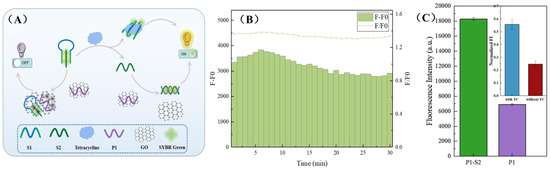 Although GO has been widely used in biological nanodevices, some researchers have pointed out that it can adsorb ssDNA and other substances. In order to further explore the reliability and the feasibility of the fluorescence spectrum in this experiment, we changed the fluorophore on the basis of the consistency of the model to prove the feasibility from another perspective. As shown in Figure 7A, cancel the FAM fluorophore labeled by P1 and use SYBR GreenⅠ to collect the transformation between the substances. SYBR GreenⅠ is a commonly used fluorescent agent in traditional biology, and it can be embedded in the small groove of the DNA double helix structure to display thousands of times fluorescence compared with the free state. Similarly, GO can also adsorb and quench free SYBR Green I through fluorescence resonance energy transfer. Therefore, it can be distinguished whether the S2 strand is successfully released and perfectly combined with P1 according to the fluorescence changes in the system before and after adding TC. The results showed that (Figure 7B), within 30 minutes of the addition of TC, the fluorescence was significantly increased, and there was a stable fluorescence difference and ratio, indicating the formation of a stable complementary double strand. In particular, when P1 exists alone, the system exhibits extremely low fluorescence; when only the P1-S2 double strand is present, the fluorescence in the system is greatly enhanced. The fluorescence values of the two were used as the lower limit/upper limit threshold, and the fluorescence standardization map with or without TC in the complete system was plotted. It can be seen that the formation of S1–S2 structure may be weakly bound to SYBR Green I and slightly increase the fluorescence of the system; however, only in the presence of TC can the required P1-S2 double helix structure be formed and greatly enhance the fluorescence of the system.