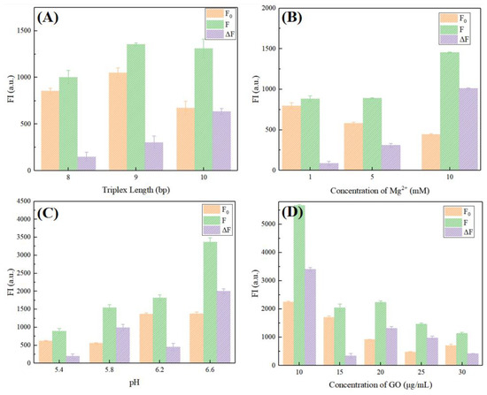 Optimization of triplex length (A), concentration of Mg2+ (B), pH value, and (C) concentration of GO (D).