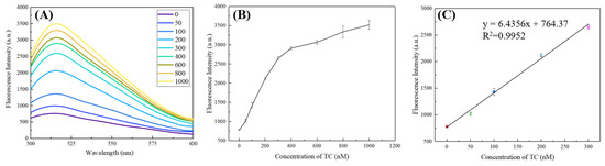 The sensitivity and specificity of the sensor are two important characteristics. Both indictors were evaluated under the optimal experimental conditions selected above. During the detection of sensitivity, TC solutions with concentrations of 0 nM, 50 nM, 100 nM, 200 nM, 300 nM, 400 nM, 600 nM, 800 nM, and 1000 nM were added respectively for fluorescence characterization under the same conditions.