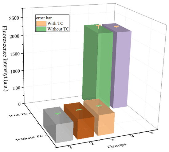 It should be noted that the TC aptamer sequence used in this work was shortened from the initial 76-mer to 8-mer by Kwon et al. and had a high affinity with the four TCs [tetracycline (TC), oxytetracycline (OTC), doxycycline (DOX), and chlortetracycline (CHLOR)]. Therefore, in order to explore the selectivity of the sensor for tetracycline and the anti-interference ability of its detection, quinolone antibacterial drugs represented by ofloxacin and β-lactam antibiotics represented by amoxicillin were selected as controls. Group 1 was the blank control group, amoxicillin was added to Group 2, ofloxacin was added to Group 3, TC was added to Group 4, and group 5 was a mixture of amoxicillin, ofloxacin, and TC, so as to verify whether TC can be sensitive to detection in complex situations. The results showed that when only amoxicillin or ofloxacin was present in the component, the fluorescence intensity that the system could recover was extremely limited, which was basically the same as the background fluorescence. In addition, for TC, whether added alone or as a type of the mixture, its presence can greatly restore the fluorescence in the system. The results proved that the designed model not only has the ability to recognize TC but also has a certain anti-interference ability (Figure 10).