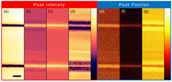 Two-dimensional spatial distributions of the Raman spectra representing (a–d) peak intensities and (e–g) peak positions obtained at room temperature. Channel details can be found in Table 1. The scale bar is 10 μm.