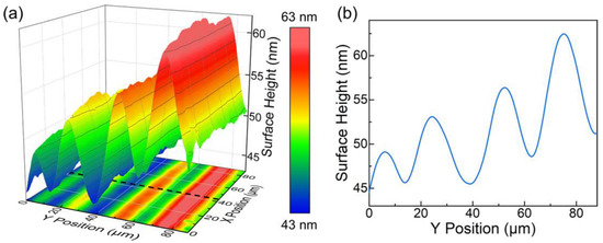 (a) Three-dimensional contour map of the femtosecond laser processed region on the x × y facet. The raw data are releveled according to other unprocessed regions of the sample surface. (b) The height profile along the black dotted line in (a).